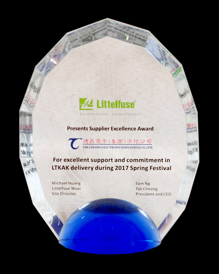 2017年5月,國(guó)際著名半導(dǎo)體企業(yè)Littelfuse授予我司“卓越服務(wù)獎(jiǎng)”。
