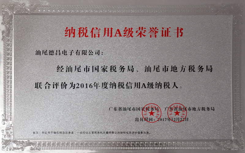 Apr. 13, 2018 After the joint evaluation by the Shanwei Municipal office SAT and the Shanwei Municipal Local Taxation Bureau, our company was awarded “The Class A Taxpayer of Y2016”.
